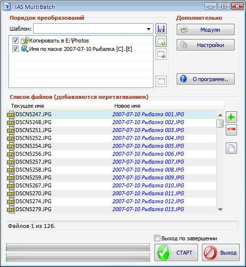 IAS MultiBatch обеспечивает произведение любой комбинации доступных действий в любом порядке над любым количеством файлов. Например, при комбинации нужных действий можно переместить музыкальные файлы в нужную папку, изменив их имя по тегу ID3 и добавив в имя файла сегодняшнюю дату и время и т.д. и т.п.